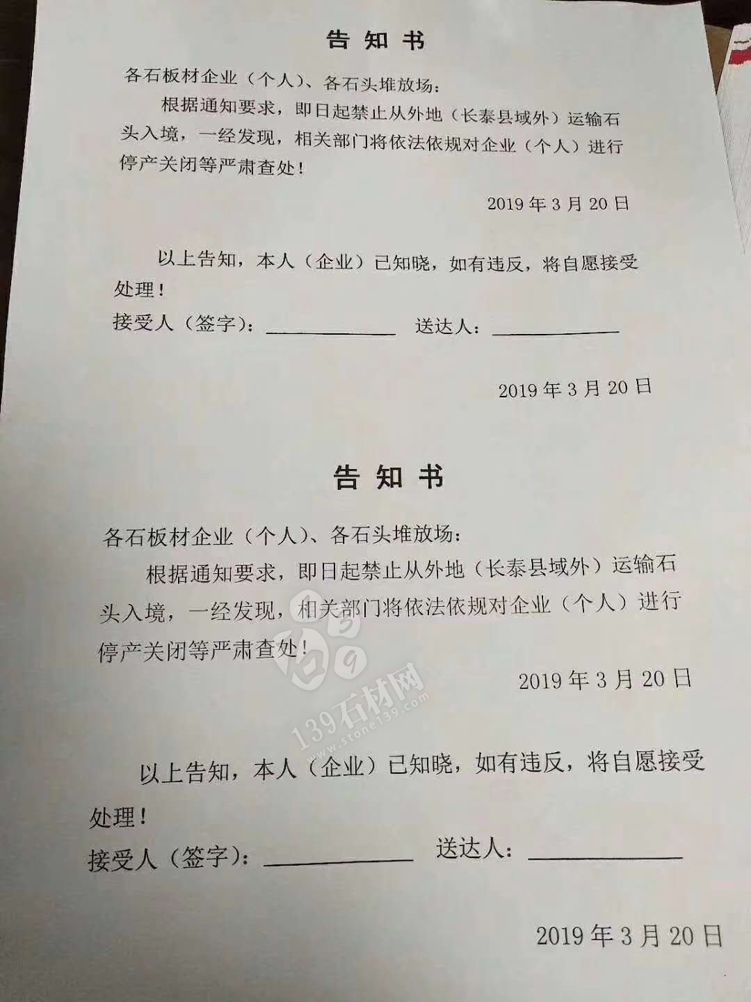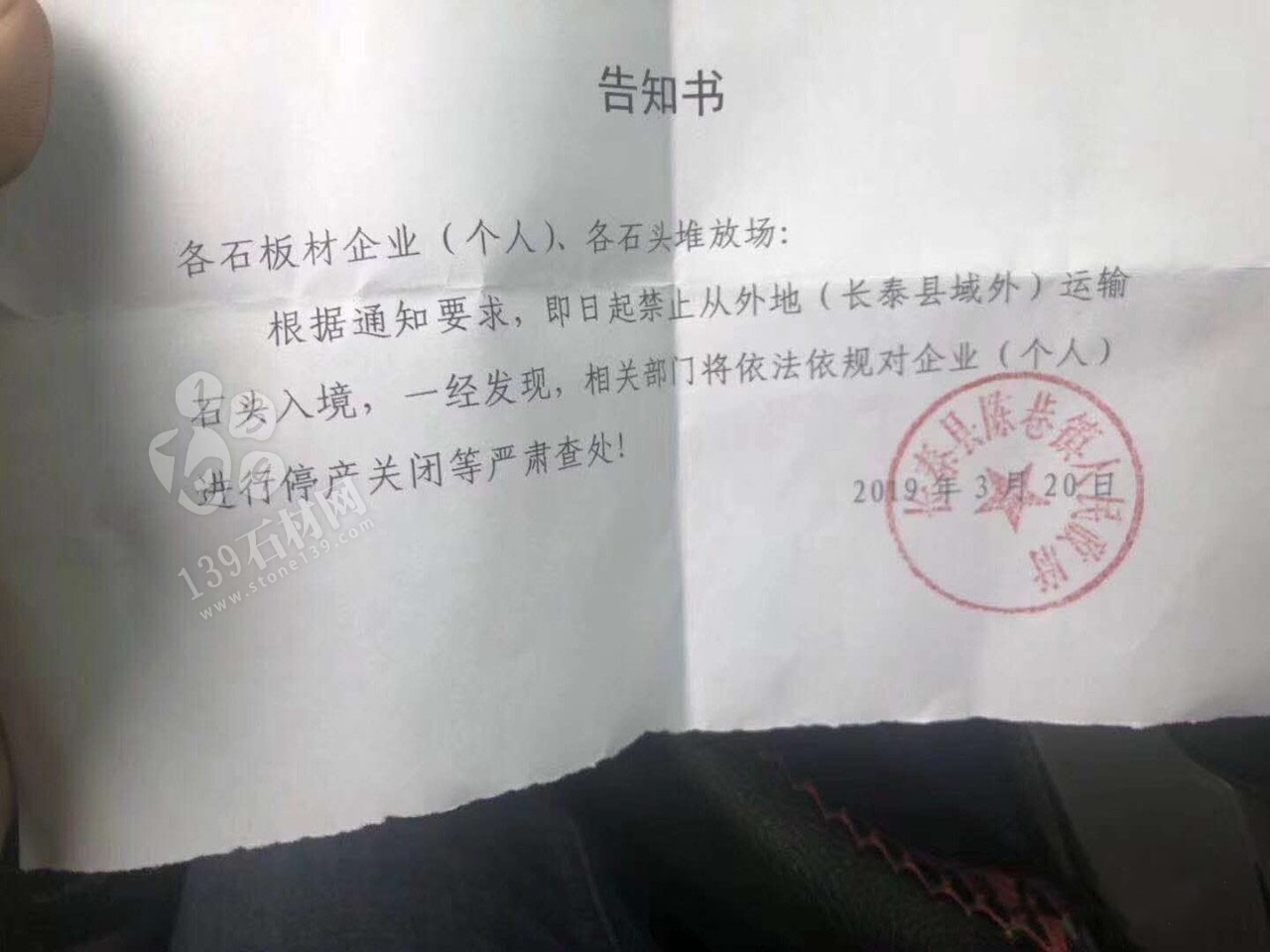 更有消息稱:長泰縣禁止從外地運輸石材入境,違者停產關閉處理,蓋章原件: