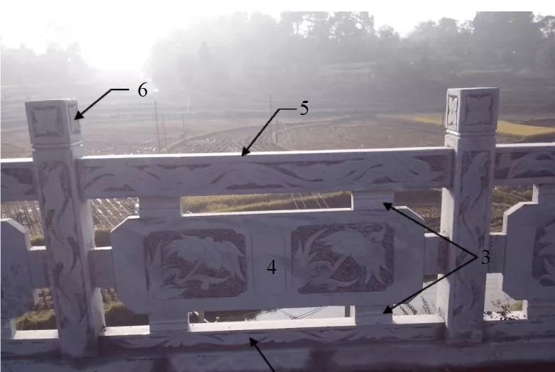 1-地栿石 2-下扶手 3-墊塊 4-攔板 5-上扶手 6-立柱