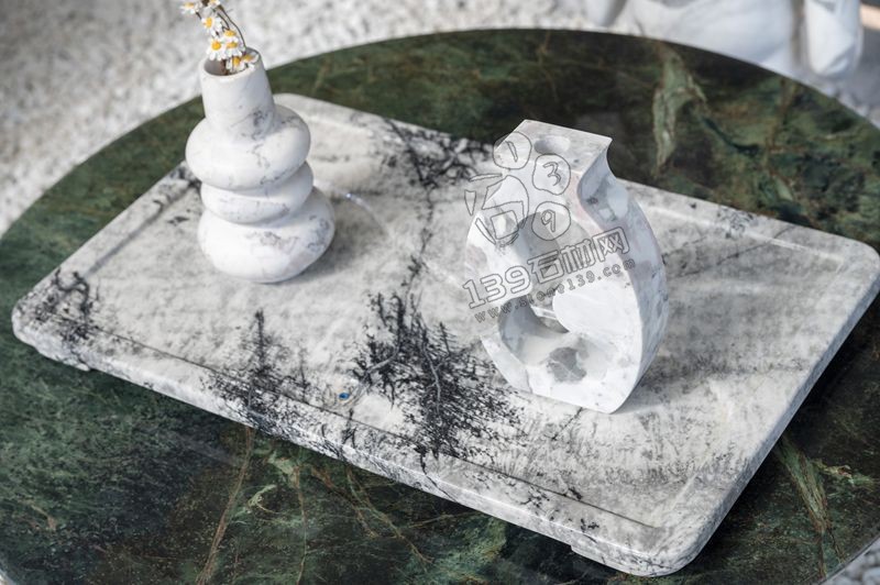 新中式:推薦山水紋路的青玉石、山水畫大理石作為屏風或茶臺。