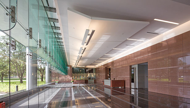 整個項目花了一年半的時間里從開始到結束完成設計,約9600平方英尺的紅色花崗巖,3200平方英尺的Mesabi黑色花崗巖和2600平方英尺的冷泉黑色花崗巖拋光,打磨和熱完成工作——由Coldspring冷泉,MN。 的材料被用于部分外立面,內部大堂墻壁和地板上。 此外,拋光切諾基白色大理石鋪路材料,由田納西大理石公司Friendsville,TN,被合并為口音到地板的模式。