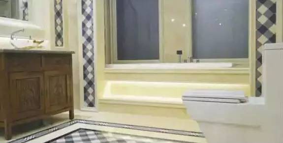 石英石的拼接設計也是可以花樣百出的,在仿古浴室柜與白色馬桶之間,它規劃出自己的界限,長方形的邊界之內,是石英石材質的霸氣彰顯,可遠觀,可近看,細微與粗獷兼而有之。