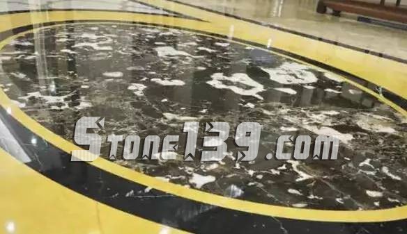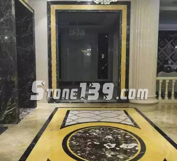 過道以方圓圖形展示,寓意沒有規矩不成方圓,黑色與金黃色的色系搭配,令空間大氣莊重,環形圖案內的石材運用,頗具獨到之處,斑斕,深沉,有內蘊乾坤之感。