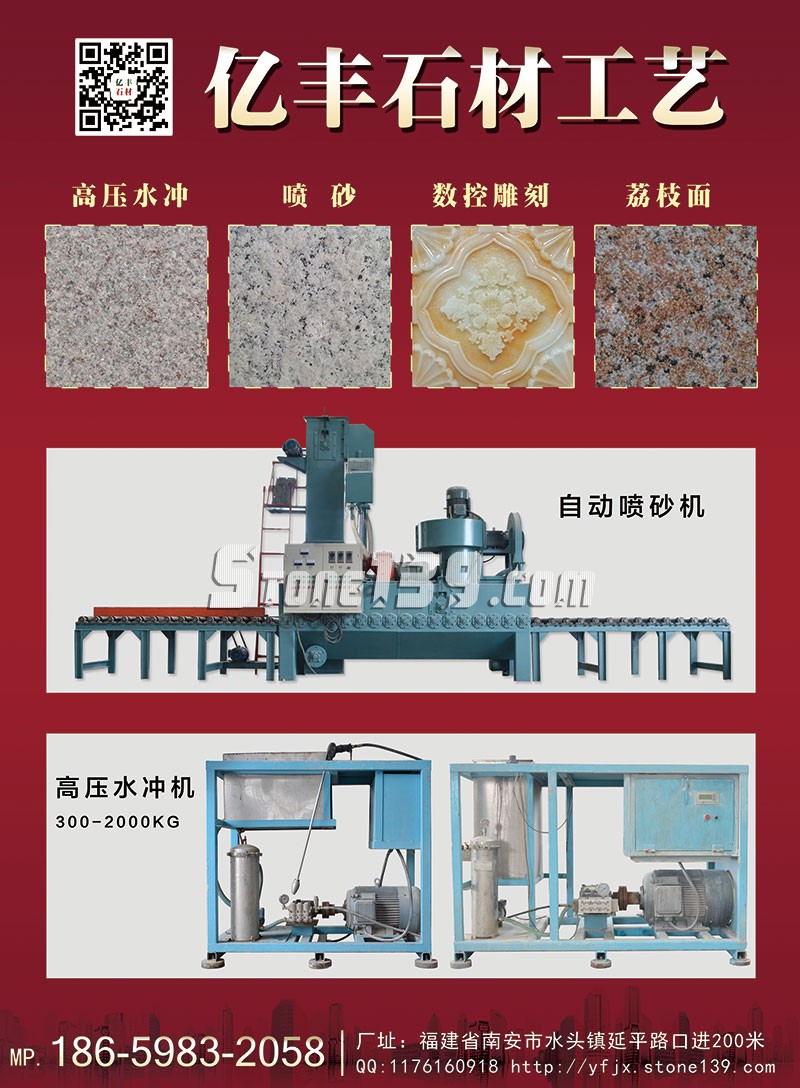 中國石材城”之美譽的福建省南安市水頭鎮,地處泉、廈、漳的金三角地帶。 本廠是主要生產加工石材數控雕刻、石材高壓水沖加工、石材噴砂面加工、自動荔枝面加工、并有自動噴砂機和高壓水沖機出售。根據客戶要求加工各種規格尺寸,保證質量工期。 我們時刻期待著為您服務!