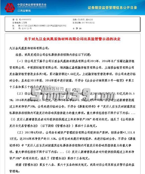 近日,記者查閱中國證券監督管理委員會——江西局網站獲悉,九江金鳳凰裝飾材料有限公司因在私募債券存續期內存在問題被江西證監局采取出具警示函的監管措施。